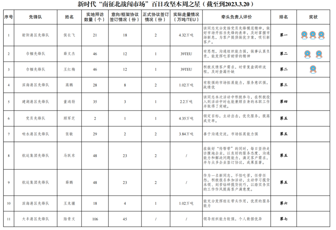 黨員先鋒隊袁增明說道:作為一個轉業(yè)的老共產黨員,每天拜訪企業(yè)前,我都會提前做好功課,了解企業(yè)的物流需求,做到不打沒有準備的仗;遇到不懂的業(yè)務問題時,我也會虛心向“小年輕”同事們請教,三人行必有我?guī)?,這次新時代“南征北戰(zhàn)闖市場”活動,我一定會全力以赴,為鹽城港貢獻一份力量。