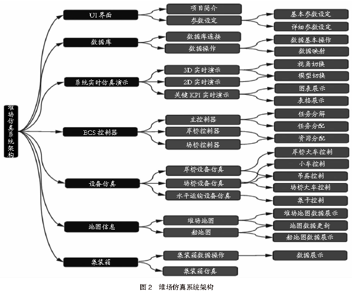 3仿真模型搭建3.1 堆場仿真系統(tǒng)架構(gòu)根據(jù)港口堆場作業(yè)特點(diǎn)和堆場系統(tǒng)功能,設(shè)計(jì)搭建港口堆場仿真系統(tǒng)架構(gòu)。該架構(gòu)主要包括UI界面、數(shù)據(jù)庫、系統(tǒng)實(shí)時(shí)仿真演示、ECS控制器、設(shè)備仿真、地圖信息、集裝箱等部分,主要用于實(shí)現(xiàn)數(shù)據(jù)交互、模型設(shè)計(jì)、任務(wù)調(diào)度管理、仿真測試、結(jié)果演示等功能。堆場仿真系統(tǒng)架構(gòu)見圖2。