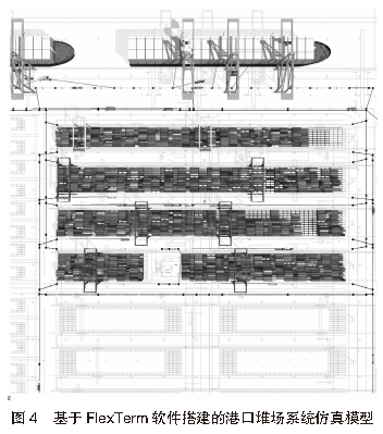 3.2 堆場仿真系統(tǒng)模型根據(jù)堆場仿真系統(tǒng)架構(gòu),以某港口自動(dòng)化堆場作業(yè)的實(shí)際運(yùn)行環(huán)境為基礎(chǔ),分別搭建基于AnyLogic軟件和FlexTerm軟件的港口自動(dòng)化堆場系統(tǒng)仿真模型?;贏nyLogic軟件搭建的港口堆場系統(tǒng)仿真模型見圖3,基于FlexTerm軟件搭建的港口堆場系統(tǒng)仿真模型見圖4。