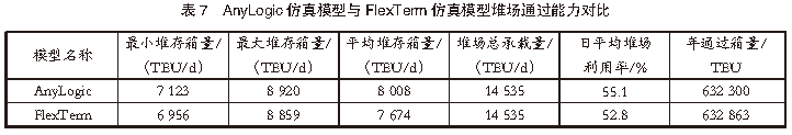 經(jīng)綜合分析發(fā)現(xiàn),無論是單一場橋利用率還是平均場橋利用率,AnyLogic仿真模型的數(shù)據(jù)結(jié)果都普遍高于FlexTerm仿真模型的數(shù)據(jù)結(jié)果。通過分析堆場作業(yè)系統(tǒng)仿真流程發(fā)現(xiàn),上述差異是由2種仿真模型的作業(yè)指令生成模式不同導(dǎo)致的。在相同的作業(yè)時(shí)段內(nèi),AnyLogic仿真模型的作業(yè)指令生成的作業(yè)數(shù)量要高于FlexTerm仿真模型的作業(yè)指令生成的作業(yè)數(shù)量,從而導(dǎo)致AnyLogic仿真模型的場橋利用率高于FlexTerm仿真模型的場橋利用率。根據(jù)港口提供的數(shù)據(jù),全年該港口自動(dòng)化堆場的場橋利用率在40%~60%?;贏nyLogic仿真模型和FlexTerm仿真模型仿真得到的平均場橋利用率分別為42.4%、35.7%。顯然,與FlexTerm仿真模型的仿真結(jié)果相比,AnyLogic仿真模型的仿真結(jié)果同實(shí)際作業(yè)數(shù)據(jù)的統(tǒng)計(jì)結(jié)果更接近。究其原因,這是由2款仿真模型的集裝箱裝卸作業(yè)指令的生成模式不同導(dǎo)致的。對堆場作業(yè)系統(tǒng)仿真流程分析發(fā)現(xiàn):在AnyLogic仿真模型中,集裝箱裝卸作業(yè)指令是根據(jù)港口歷史數(shù)據(jù),借助算法計(jì)算生成的,比較接近港口的實(shí)際作業(yè)數(shù)據(jù);在FlexTerm仿真模型中,集裝箱裝卸作業(yè)指令是利用軟件自帶作業(yè)計(jì)劃模塊,通過配置船期、堆場計(jì)劃等參數(shù)自動(dòng)生成的,與港口實(shí)際作業(yè)數(shù)據(jù)之間存在一定的差距。4.2 堆場使用情況對比為了合理規(guī)劃堆場空間資源,根據(jù)港口提供的船期、堆場計(jì)劃等參數(shù),對港口堆場的使用情況進(jìn)行仿真對比分析。AnyLogic仿真模型與FlexTerm仿真模型堆場通過能力對比見表7。由表7可知,在相同輸入條件下,AnyLogic仿真模型和FlexTerm仿真模型仿真模擬得到的堆場利用情況和堆場通過能力基本一致。但由于泊位船舶計(jì)劃較為寬松,船期密度小于實(shí)際船期數(shù)據(jù),AnyLogic仿真模型和FlexTerm仿真模型的堆場通過箱量分別為632 300 TEU和632 863 TEU,均小于港口全年實(shí)際堆場通過箱量724 272 TEU。