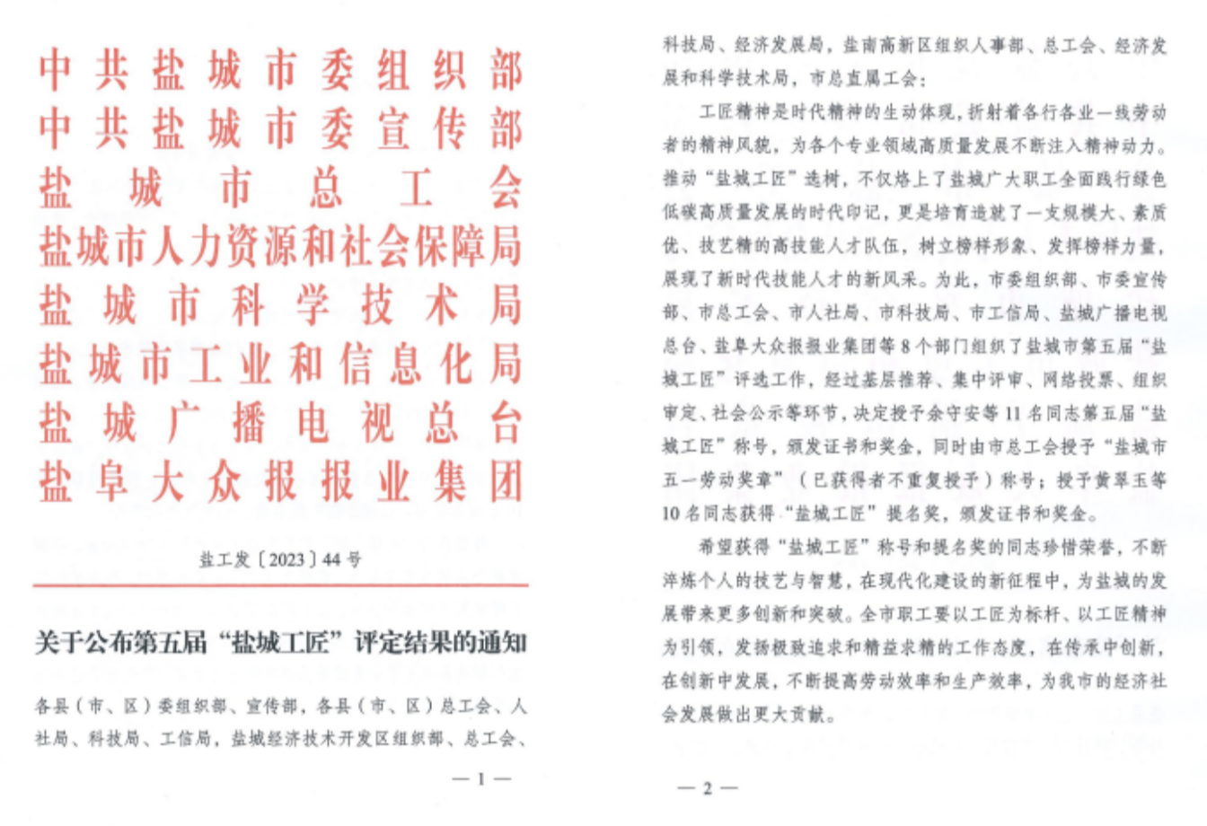 近日,由市委組織部、市委宣傳部、市總工會、市人力資源和社會保障局等8個部門組織了鹽城市第五屆“鹽城工匠”評選工作,決定授予江蘇鹽城港上港國際港務(wù)有限公司丁浩明同志“鹽城工匠”稱號。