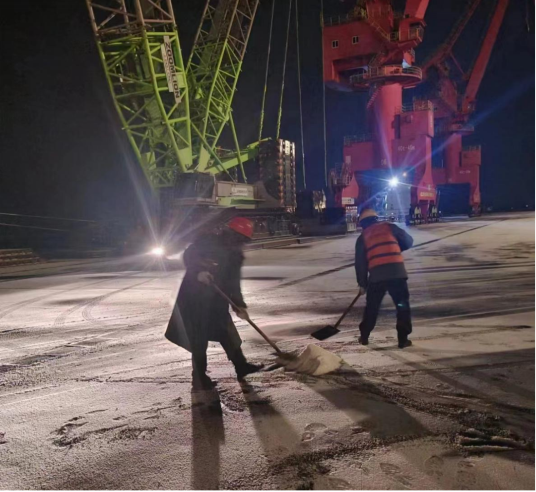 為保證車(chē)輛的裝卸和安全行駛,22日夜間,射陽(yáng)港區(qū)風(fēng)電公司第一時(shí)間對(duì)積雪進(jìn)行了撒鹽融化處理,并用鐵鍬和掃帚將積雪清理到道路兩旁,以防止夜間結(jié)冰。