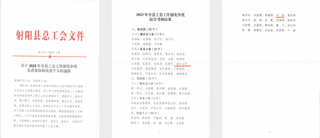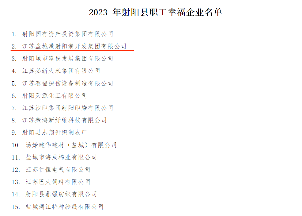 近日,射陽縣總工會公示了2023年射陽縣“職工幸福企業(yè)”名單、縣工會工作爭先創(chuàng)優(yōu)綜合考核結(jié)果,射陽港開發(fā)集團(tuán)榜上有名,再獲新榮譽(yù)。