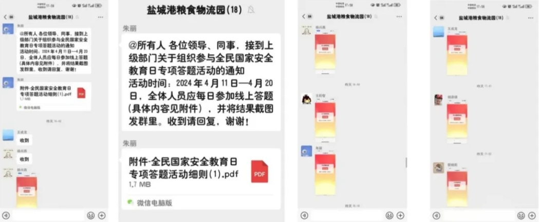 線上利用公司微信群、黨員學(xué)習(xí)微信群發(fā)送學(xué)習(xí)資料,全方位、多角度宣傳國家安全知識(shí),進(jìn)一步增強(qiáng)“國家安全無小事”的觀念和意識(shí)。