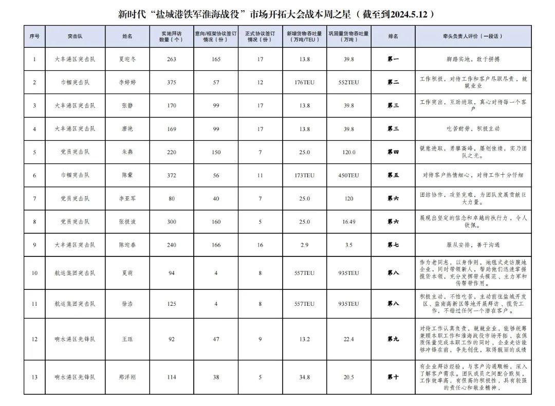 第一名:大豐港區(qū)突擊隊(duì) 夏迎冬(拜訪客戶263家,簽訂意向協(xié)議165份,簽訂正式協(xié)議17份,新增貨物吞吐量13.8萬(wàn)噸,鞏固量貨物吞吐量39.8萬(wàn)噸);