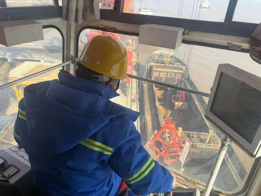 他攀至高聳門機(jī)頂端,低頭細(xì)致檢查設(shè)備,專注各部件運(yùn)行健康狀況。每一次低頭,都是對(duì)設(shè)備安全的守護(hù)。