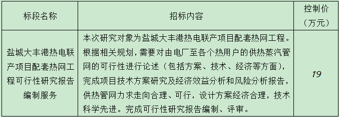 鹽城大豐港熱電聯(lián)產(chǎn)項(xiàng)目配套熱網(wǎng)工程可行性研究報(bào)告編制服務(wù)已經(jīng)相關(guān)部門批準(zhǔn)實(shí)施, 項(xiàng)目所需資金來源自籌已落實(shí)?,F(xiàn)決定對(duì)該項(xiàng)目進(jìn)行公開招標(biāo),擇優(yōu)選定承包人。