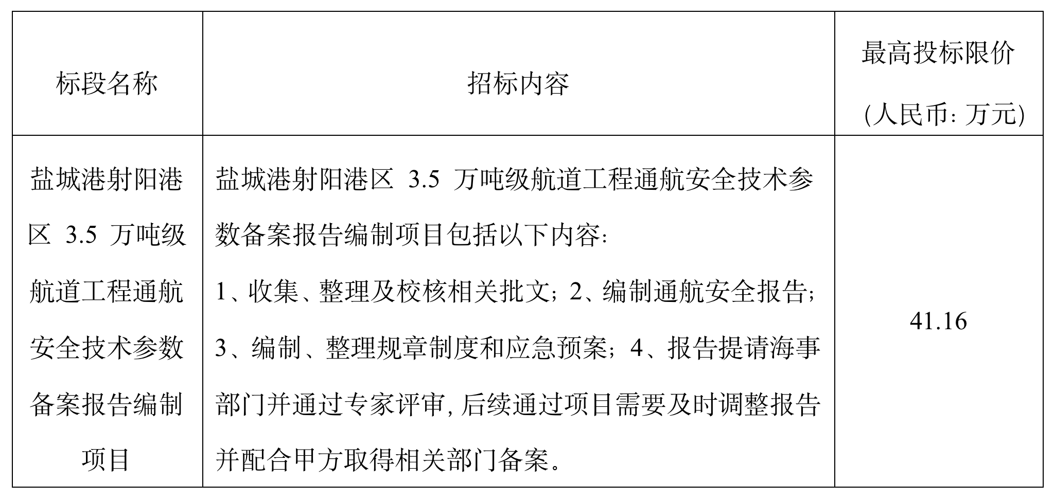 一、江蘇鹽城港射陽港開發(fā)集團(tuán)有限公司負(fù)責(zé)實施的鹽城港射陽港區(qū) 3.5 萬噸級航道工程通航安全技術(shù)參數(shù)備案報告編制項目,已經(jīng)相關(guān)部門批準(zhǔn)建設(shè)?,F(xiàn)決定對該項目進(jìn)行公開招標(biāo),現(xiàn)邀請潛在投標(biāo)人參加本項目投標(biāo)。