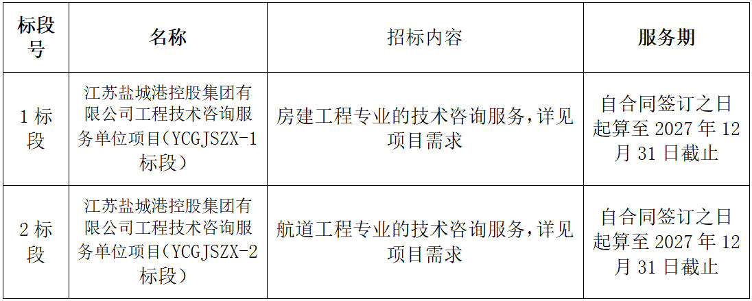 江蘇鹽城港控股集團(tuán)有限公司因工作需要,現(xiàn)通過公開招標(biāo)方式,選擇技術(shù)咨詢服務(wù)單位,請(qǐng)潛在的投標(biāo)人參加本服務(wù)采購的投標(biāo)報(bào)名,現(xiàn)就有關(guān)事項(xiàng)公告如下。
