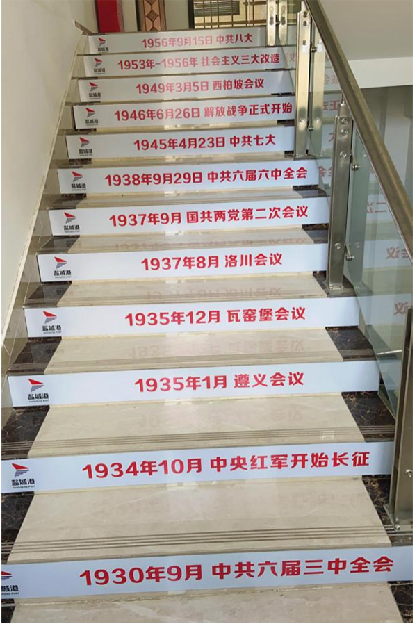 針對廣大干部職工工作實際,響水港區(qū)精心設(shè)計,細心研究,將學(xué)習(xí)形式和載體不斷創(chuàng)新。近日,響水港區(qū)創(chuàng)新打造“樓梯課堂”,將黨史發(fā)展時間歷程貼印在樓梯上,方便大家在上班閑暇時,無形地將黨史知識學(xué)進腦子里。“樓梯課堂”的每一個階梯同時也代表著黨的每一個發(fā)展歷程,一步一臺階,扎扎實實譜新篇。響水港區(qū)員工普遍反映這個學(xué)習(xí)方式有創(chuàng)意有實效,鞏固加深了他們對黨史的掌握程度,也提高了他們學(xué)習(xí)黨史的興趣。