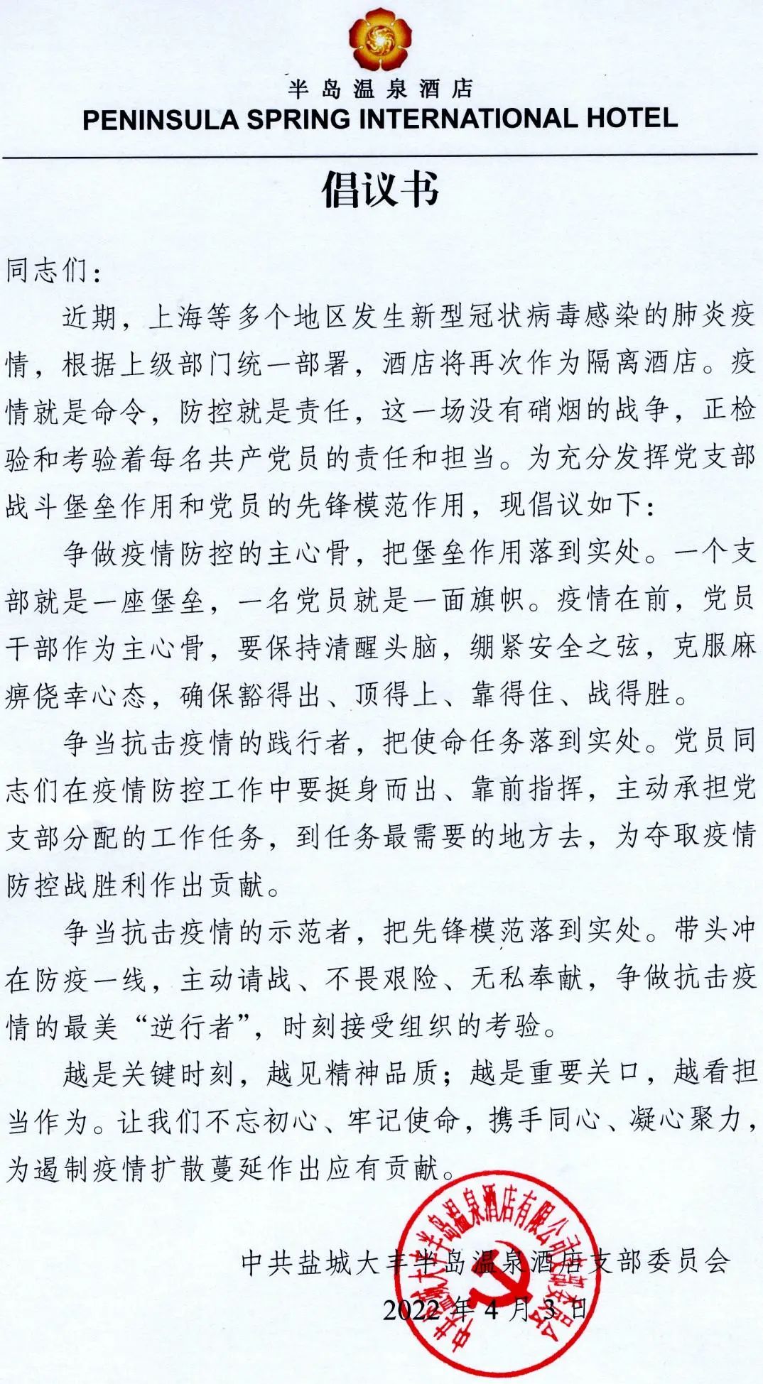 “我請(qǐng)?jiān)福鹤栽竻⒓泳频暌痪€防疫工作,充分發(fā)揮黨員先鋒帶頭作用,堅(jiān)決打贏疫情防控阻擊戰(zhàn)。”“我請(qǐng)?jiān)福鹤鰢?yán)明紀(jì)律的踐行者,做擔(dān)當(dāng)履職的戰(zhàn)斗員,請(qǐng)領(lǐng)導(dǎo)批準(zhǔn)我參與此次隔離任務(wù)?!薄拔沂且幻朦h積極分子,我志愿參與酒店疫情防控任務(wù),請(qǐng)讓我上一線”……一封封按著紅色手印的《請(qǐng)戰(zhàn)書》被遞交到鹽城港文旅集團(tuán)旗下半島溫泉酒店黨支部。