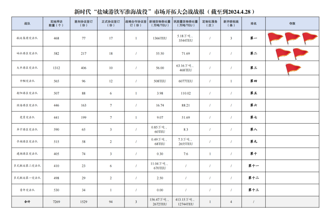 1.累計拜訪客戶數(shù)量7269家:其中大豐港區(qū)突擊隊1312家,阜寧港區(qū)突擊隊590家,響水港區(qū)突擊隊582家,巾幗突擊隊565家,青年突擊隊530家,亭湖港區(qū)突擊隊515家,射陽港區(qū)突擊隊507家,多式聯(lián)運第一突擊隊498家,航運集團突擊隊468家,濱海港區(qū)突擊隊446家,黨員突擊隊441家,多式聯(lián)運第二突擊隊410家,建湖港區(qū)突擊隊405家。