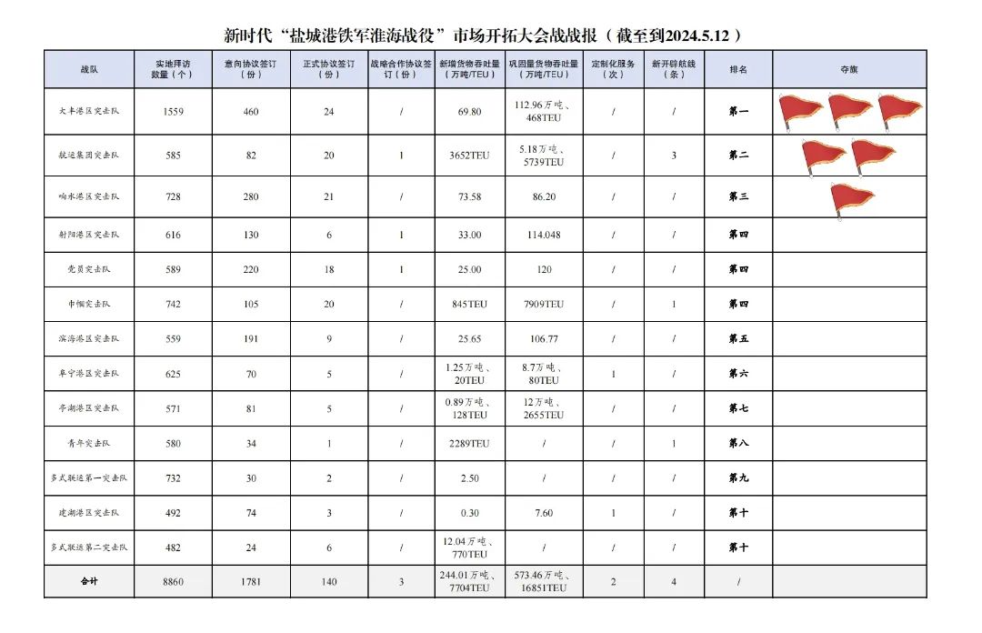 1.累計(jì)拜訪客戶數(shù)量8860家:其中大豐港區(qū)突擊隊(duì)1559家,巾幗突擊隊(duì)742家,多式聯(lián)運(yùn)第一突擊隊(duì)732家,響水港區(qū)突擊隊(duì)728家,阜寧港區(qū)突擊隊(duì)625家,射陽(yáng)港區(qū)突擊隊(duì)616家,黨員突擊隊(duì)589家,航運(yùn)集團(tuán)突擊隊(duì)585家,青年突擊隊(duì)580家,亭湖港區(qū)突擊隊(duì)571家,濱海港區(qū)突擊隊(duì)559家,建湖港區(qū)突擊隊(duì)492家,多式聯(lián)運(yùn)第二突擊隊(duì)482家。
