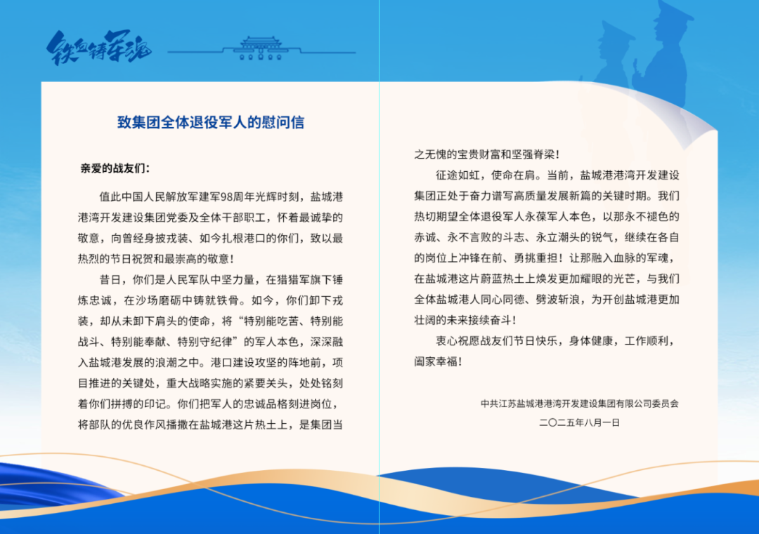 港灣集團(tuán)、物流集團(tuán)向奮戰(zhàn)在各崗位的退役軍人同志們送上慰問(wèn)信,以筆墨傳遞溫暖,以文字致敬榮光,凝聚著對(duì)退役軍人“轉(zhuǎn)業(yè)不轉(zhuǎn)志、退伍不褪色”精神品格的崇高禮贊,飽含著對(duì)退役軍人群體“永葆軍人本色、爭(zhēng)當(dāng)行業(yè)標(biāo)兵”的殷切期許。