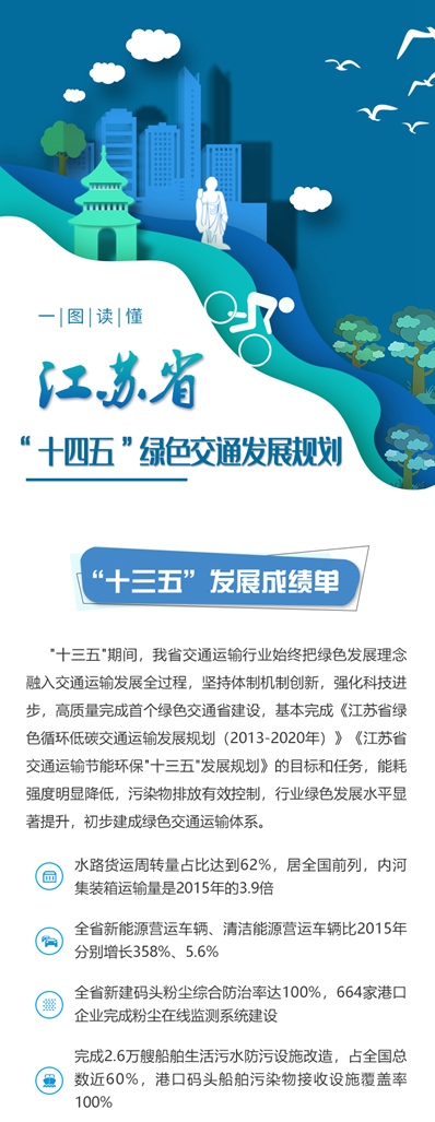 至“十四五”末,全面實(shí)現(xiàn)綠色能源消費(fèi)占比、岸電使用率、鐵路和水路運(yùn)輸周轉(zhuǎn)量占比、綠色出行比例“4提升”,營(yíng)運(yùn)貨車(chē)、營(yíng)運(yùn)貨船、港口生產(chǎn)碳排放強(qiáng)度和營(yíng)運(yùn)船舶氮氧化物排放總量“4下降”——近日,省交通運(yùn)輸廳正式印發(fā)《江蘇省“十四五”綠色交通發(fā)展規(guī)劃》(以下簡(jiǎn)稱(chēng)《規(guī)劃》),明確提出“十四五”期間全省綠色交通發(fā)展按照“11478”的思路開(kāi)展,實(shí)現(xiàn)“4升4降”,形成與資源環(huán)境承載力相匹配、與生產(chǎn)生活生態(tài)相協(xié)調(diào)的交通運(yùn)輸發(fā)展新格局,有效支撐我省碳達(dá)峰碳中和目標(biāo)如期實(shí)現(xiàn)。