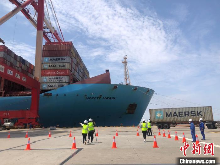 5月31日,27個(gè)從加拿大溫哥華進(jìn)口至中國的集裝箱,在上海洋山深水港碼頭被裝上“美若馬士基”輪。上海自貿(mào)區(qū)臨港新片區(qū)官方供圖
