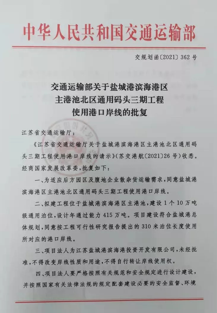 近日,交通運輸部批復鹽城港濱海港區(qū)主港池北區(qū)通用碼頭三期工程使用港口岸線的請示(交規(guī)劃函〔2021〕362號)、省發(fā)展改革委批復鹽城港濱海港區(qū)北港池防波堤一期工程可行性研究報告(蘇發(fā)改基礎(chǔ)發(fā)〔2021〕672號),標志濱海港區(qū)重大項目前期工作取得突破性進展。