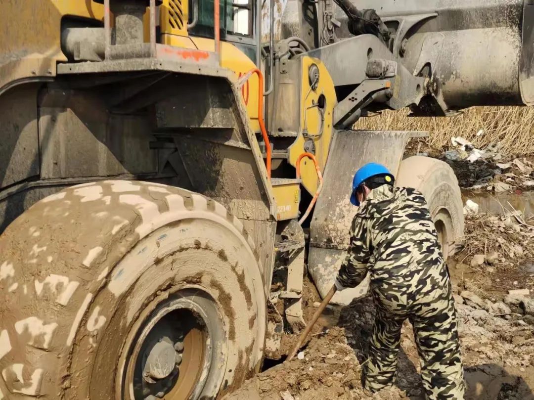 面對(duì)連續(xù)的失敗,響水港區(qū)團(tuán)隊(duì)再次展現(xiàn)出了百折不撓,迎難而上的港口工匠精神,深刻剖析前兩次失敗原因,再次調(diào)集一臺(tái)小型挖機(jī)對(duì)事件車輛輪子周邊淤泥進(jìn)行清理,回填石子提升其自身摩擦力,同時(shí)針對(duì)涉險(xiǎn)裝載機(jī)陷入太深可能造成底盤擱置等情況,調(diào)配一輛裝載機(jī)協(xié)助抬升予以解決,并再次調(diào)集一輛裝載機(jī)采用接力模式增加牽引力。經(jīng)過多臺(tái)機(jī)械的通力配合,受困裝載機(jī)終于在拖拽中緩緩駛出泥潭,圓滿完成救援工作。
