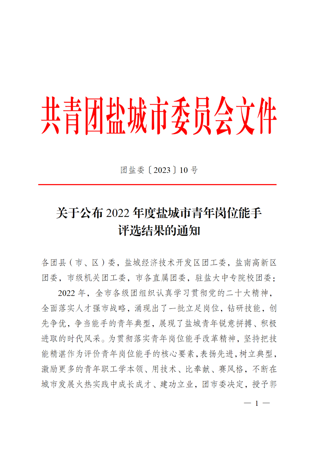 近日,共青團鹽城市委發(fā)布《關(guān)于公布2022年度鹽城市青年崗位能手評選結(jié)果的通知》,集團丁浩明、龔海衛(wèi)、李睿三名青年同志榮獲“2022年度鹽城市青年崗位能手”稱號。