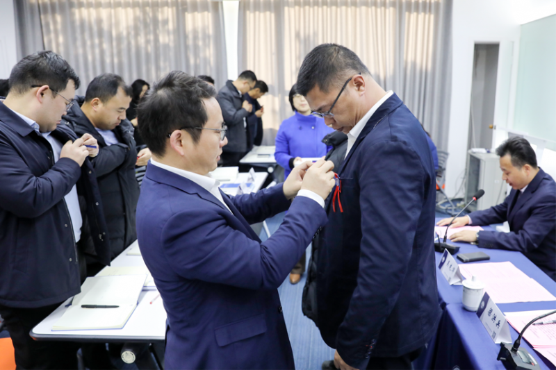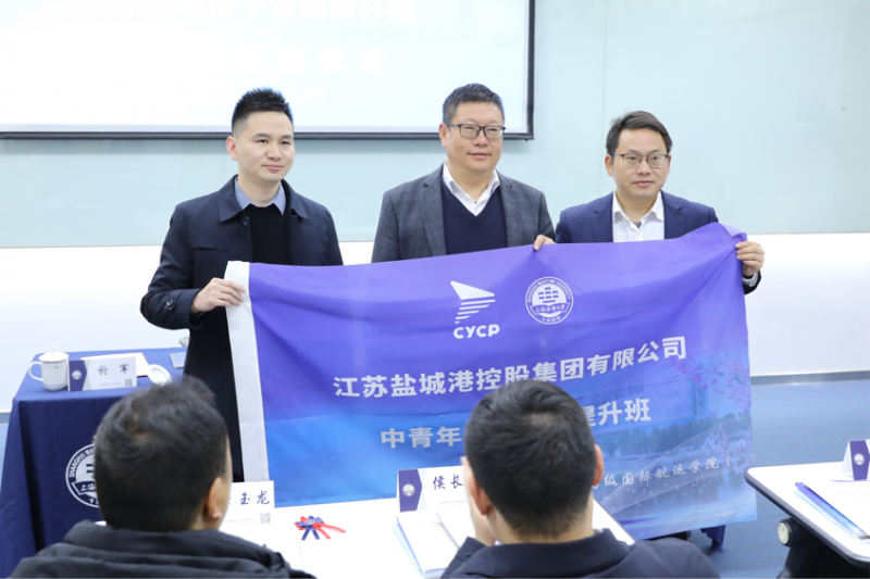 典禮上,吳先華院長(zhǎng)為學(xué)員代表佩戴?;?,吳先華、梁洪兵共同為鹽城港集團(tuán)代表授予班旗,這也代表鹽城港的各位學(xué)員正式加入上海海事大學(xué)的大家庭。