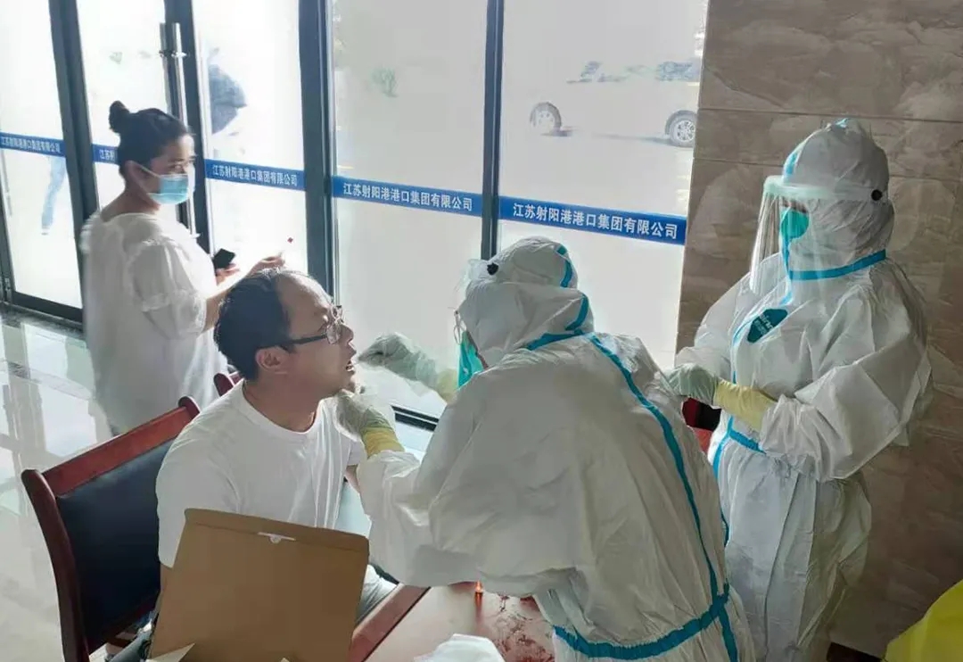 上午8時,射陽縣疾病預(yù)防控制中心醫(yī)務(wù)人員就已經(jīng)準(zhǔn)備就緒,穿上防護(hù)服,戴好護(hù)目鏡、口罩、手套,在射陽港區(qū)聯(lián)檢樓核酸檢測點開始為港區(qū)員工進(jìn)行核酸檢測。現(xiàn)場人員有序排隊,全程佩戴口罩,依次進(jìn)行檢測。截止中午12時,港區(qū)近300名員工全部完成核酸檢測。