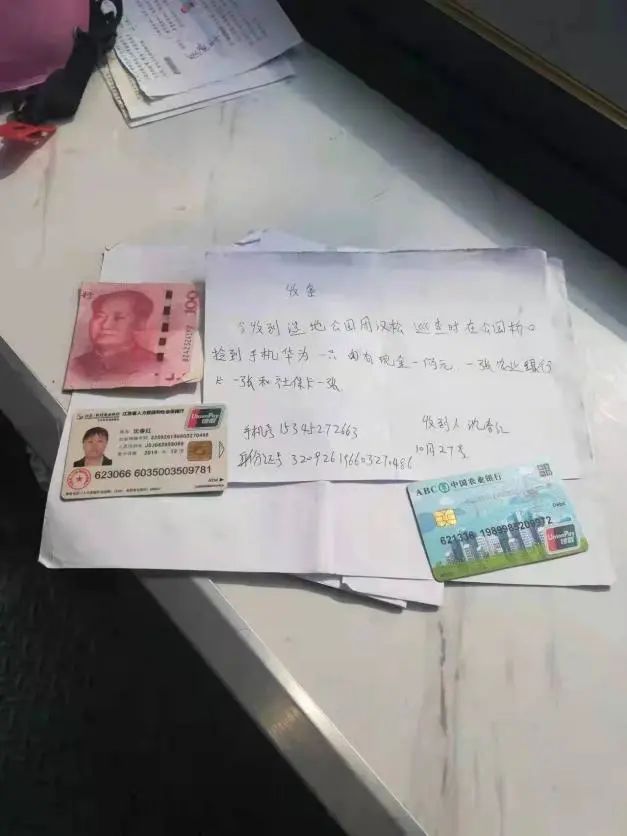 11月9日,鹽城港物業(yè)保安周漢松和往常一樣在所屬項目東郊公園內(nèi)巡邏執(zhí)勤,巡邏中發(fā)現(xiàn)馬路上“躺”著一部手機,經(jīng)檢查手機外觀未損壞能亮屏,手機背面還有銀行卡、社??吧倭楷F(xiàn)金。周漢松第一時間將現(xiàn)場情況進行上報,并時刻注意著手機來電。很快便接到了外來電話,來電人自稱是失主,周漢松在電話里告知對方方位,請對方到達現(xiàn)場進一步確認(rèn)。