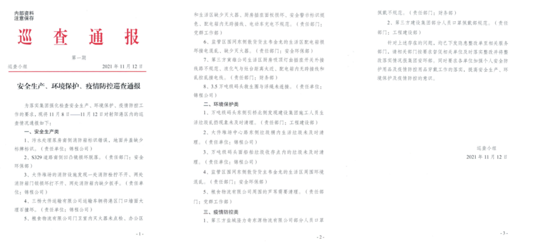 安全巡查員每日對(duì)港區(qū)內(nèi)安全生產(chǎn)、環(huán)境保護(hù)、疫情防控工作進(jìn)行檢查,對(duì)進(jìn)港人員信息登記、作業(yè)人員勞動(dòng)防護(hù)用品穿戴、作業(yè)現(xiàn)場(chǎng)安全管理等情況逐一細(xì)致排查,確保不放過(guò)一個(gè)死角,不留下一個(gè)隱患。對(duì)巡查中發(fā)現(xiàn)的問(wèn)題隱患,及時(shí)下發(fā)整改通知單,要求相關(guān)責(zé)任單位、部門限期整改,并對(duì)照整改時(shí)限進(jìn)行復(fù)查,確保隱患整改到位。