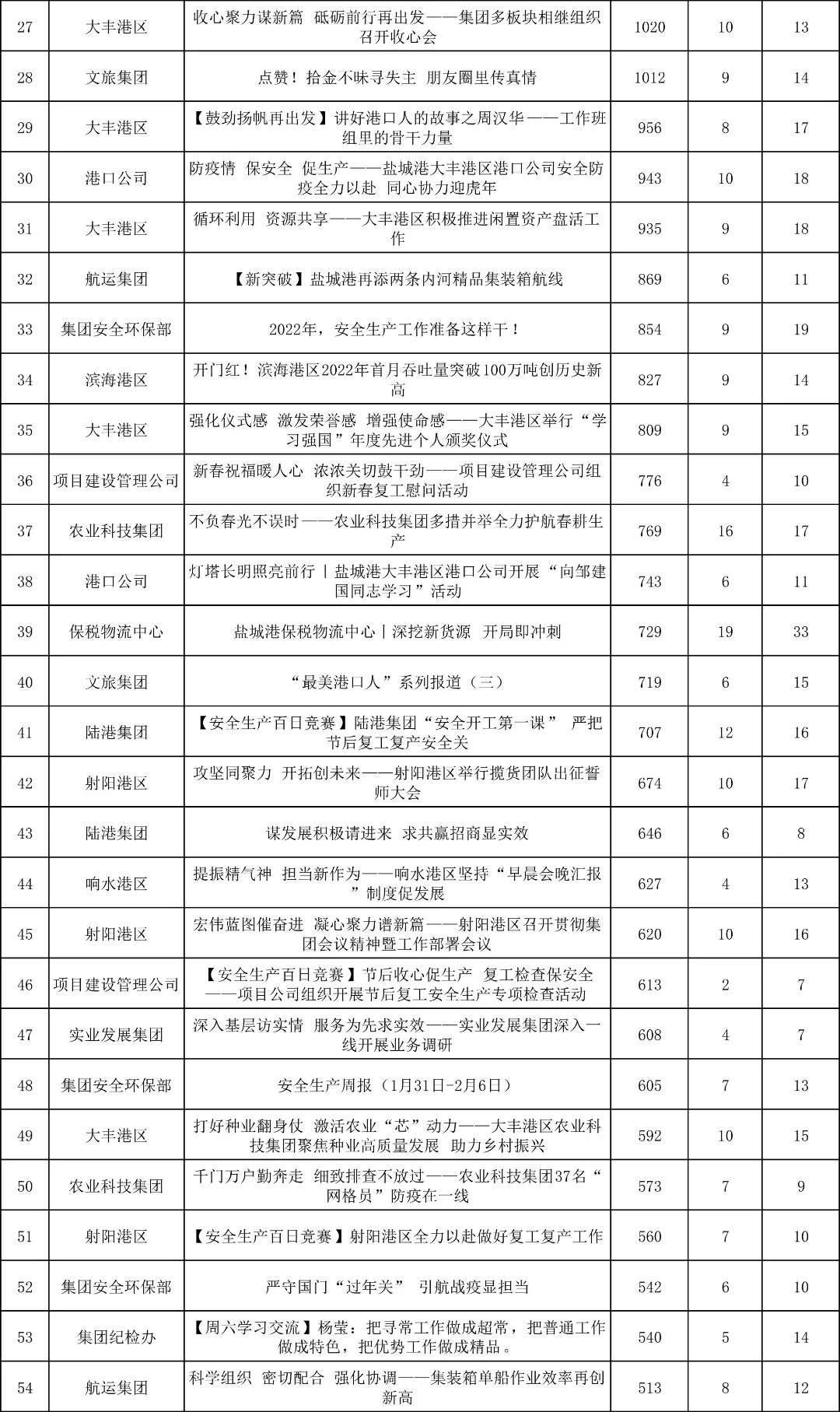 “首季開門紅”向來是新聞報(bào)道的高產(chǎn)期,特別是一線生產(chǎn)單位亮點(diǎn)頻出。從二月份稿件數(shù)據(jù)統(tǒng)計(jì)來看,大豐港區(qū)依然蟬聯(lián)第一“寶座”,發(fā)稿18篇;港口公司繼續(xù)發(fā)力,成稿11篇,位列第二;響水港區(qū)緊隨其后,發(fā)稿9篇。其他單位齊齊發(fā)力,紛紛積極供稿!