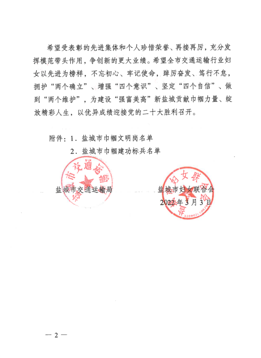 近日,市婦聯(lián)、市交通運(yùn)輸局聯(lián)合發(fā)布《關(guān)于表彰全市交通運(yùn)輸行業(yè)婦女崗位建功先進(jìn)集體(個人)的決定》,鹽城港港口公司“海燕”班組榮獲“鹽城市巾幗文明崗”榮譽(yù)稱號。