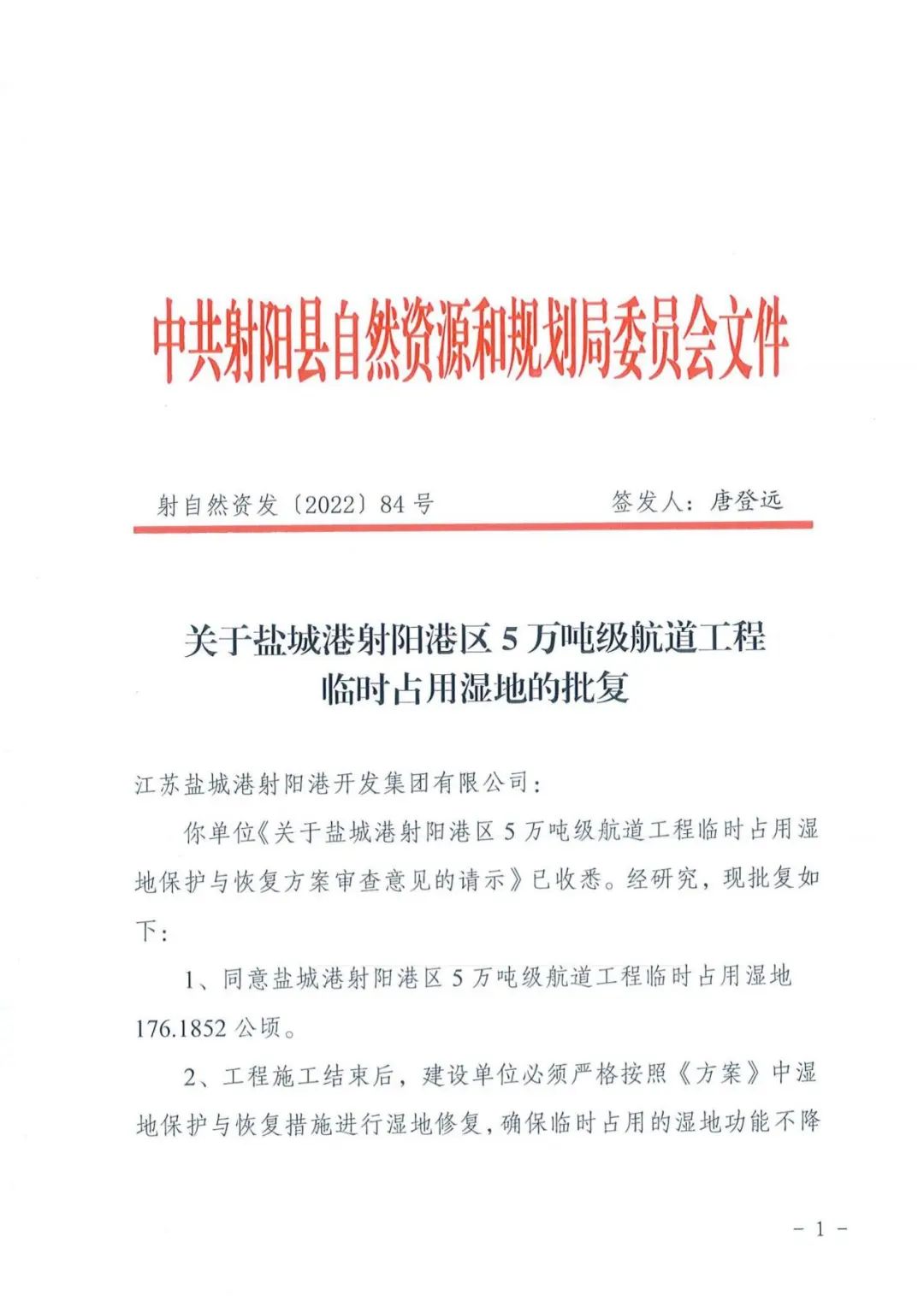 5月9日,鹽城港射陽港區(qū)5萬噸級航道工程臨時占用濕地取得縣自然資源和規(guī)劃局正式批復。至此,該項目已完成包括立項、通航評估、安全預評價等在內(nèi)的十二項前期手續(xù),向項目的正式開工又邁進了堅實一步。