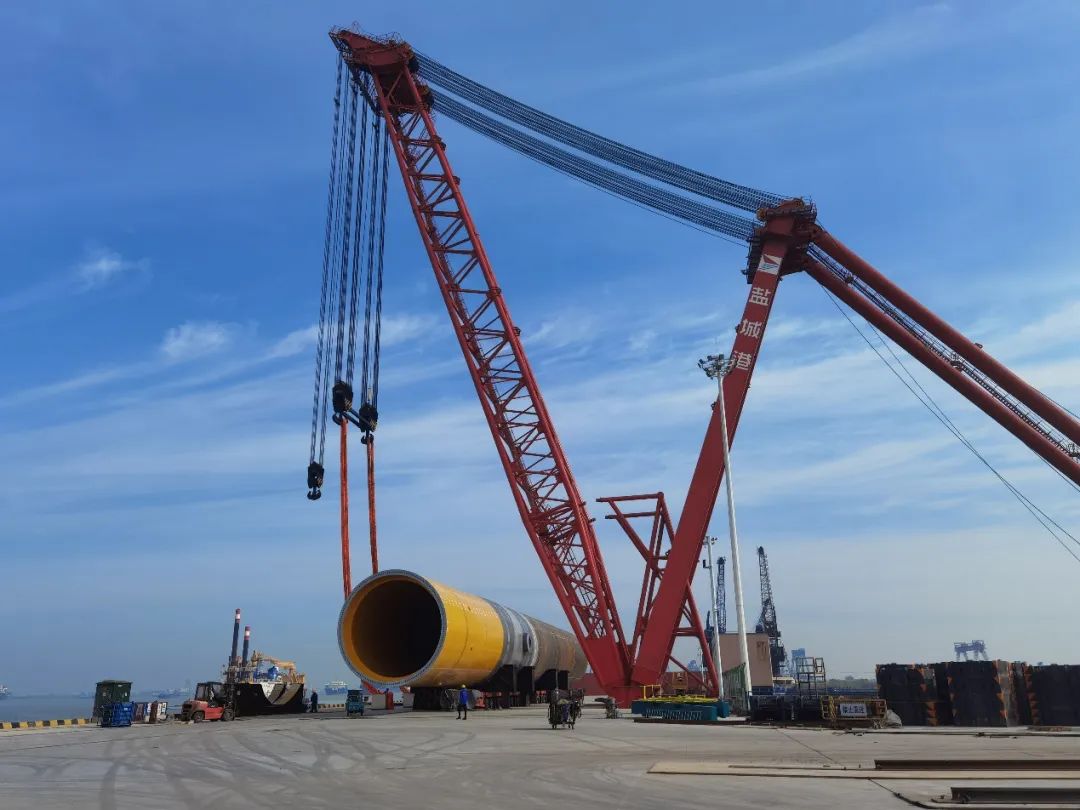 5月28日,鹽城港響水港區(qū)小蟒牛作業(yè)區(qū)公用重件碼頭現(xiàn)場一派繁忙景象,由公用重件碼頭后方陸域打砂除銹噴涂并進行拼接組裝的首件風電樁基,通過自行模塊車運輸至碼頭前沿。該件總長75米、直徑8米、總重達1055.1噸,由1100t-51m巨無霸固定桅桿吊穩(wěn)穩(wěn)吊起,緩緩地放置在駁船擱置梁上,出海駛向渤海風電建設現(xiàn)場。
