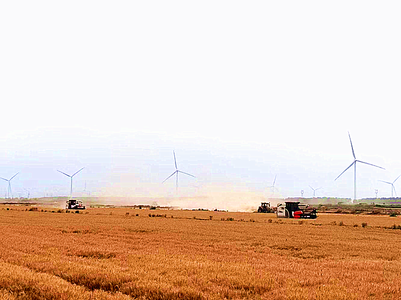 烈日下,收割機在麥田里穿梭,伴著隆隆機聲,飽滿的麥穗被吞進脫粒箱,運輸車將金黃色的麥粒運到倉庫,田間一派繁忙景象。