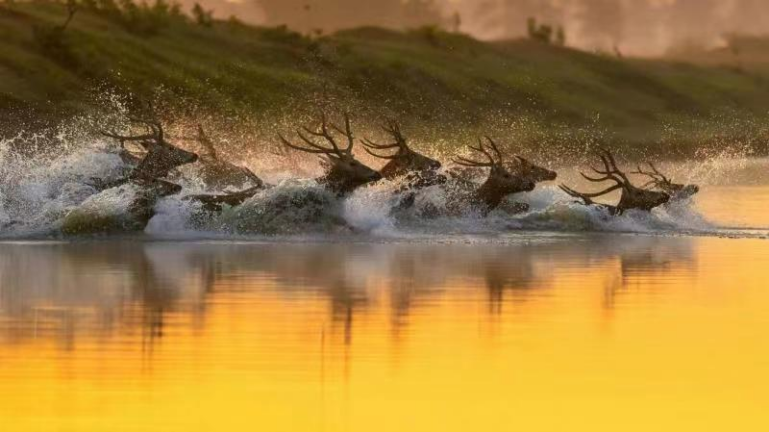 看麋鹿在淺水中的肆意奔跑