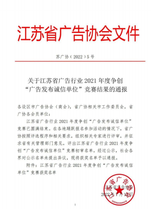 7月16日,2021年度江蘇省廣告行業(yè)廣告發(fā)布誠信單位評選結(jié)果公布,江蘇鹽城港文旅集團(tuán)文化傳媒公司再獲榮譽(yù)稱號。
