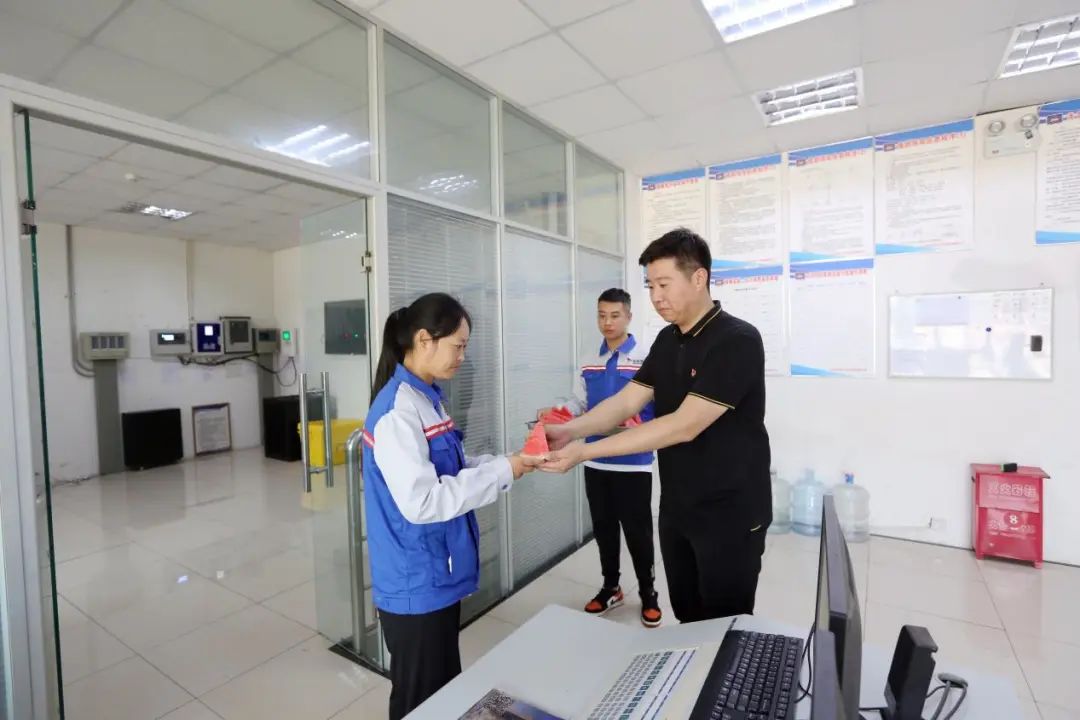 活動結(jié)束后,港區(qū)相關(guān)負(fù)責(zé)人將西瓜送至各單位一線在崗員工,為他們解暑降溫、鼓舞干勁。