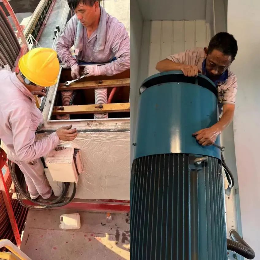 天氣炎熱,設(shè)備也?!爸惺睢薄!?#門機(jī)出現(xiàn)分波過熱故障,門機(jī)跳電了”,早上7點,剛到港的修理電工大宋就接到前方司機(jī)的報修指令。大宋隨即和同伴趕到現(xiàn)場,經(jīng)過排查,發(fā)現(xiàn)是左旋電機(jī)風(fēng)機(jī)損壞。經(jīng)過2個多小時的搶修,設(shè)備再次順利投入使用。搶修人員剛下門機(jī)還沒來得及喝口涼水,對講機(jī)里又傳來了1#門機(jī)整機(jī)跳電故障報修。經(jīng)檢查判定這是一起因電纜滑環(huán)內(nèi)外溫差導(dǎo)致設(shè)備內(nèi)部有水凝造成的設(shè)備故障。此時戶外的溫度已達(dá)35℃,而門機(jī)機(jī)房經(jīng)過陽光的烘烤已近40℃,搶修人員卻毫不遲疑,立即投入搶修工作......