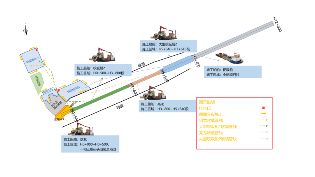 八月飄香季,奮斗正當時。在3.5萬噸航道上,機器轟鳴,“普交工1”號、“劍龍”號、“亮龍”號三“艦”合璧,將疏浚航道產(chǎn)生的疏浚土通過管線輸送到指定的納泥區(qū)。圍堰上,工人們鉚足干勁,土工布鋪設(shè)、袋裝土碼砌加緊施工……現(xiàn)場一片熱火朝天的建設(shè)景象。