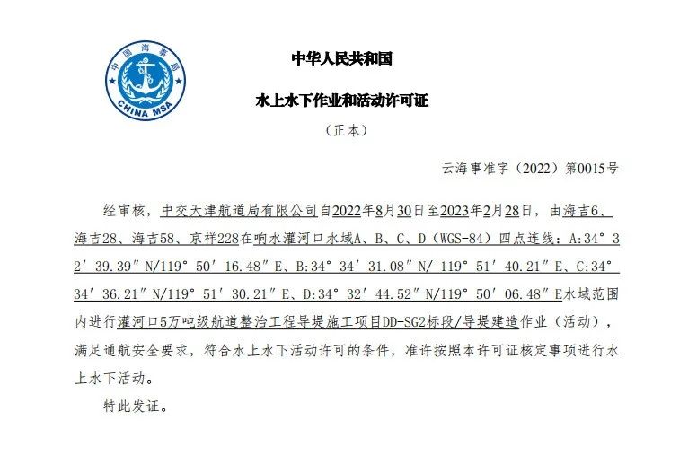 8月30日至31日,連云港海事局陸續(xù)簽發(fā)灌河口5萬噸級航道整治工程導(dǎo)堤施工一標(biāo)段和二標(biāo)段水上水下活動許可證,標(biāo)志導(dǎo)堤工程施工前手續(xù)全部完成,為灌河口5萬噸級航道整治工程的全面開展邁出了重要一步。