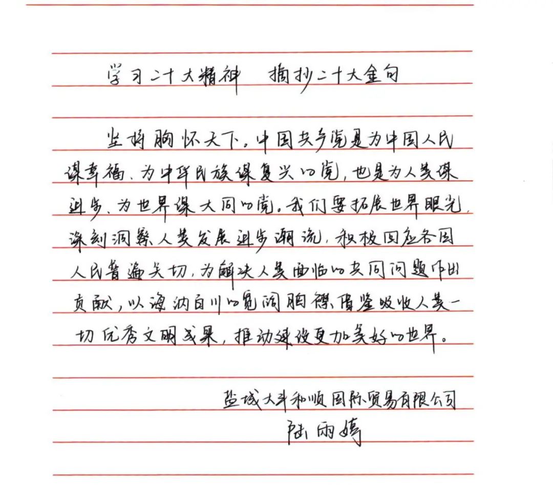通過手抄黨的二十大報告“金句”的學習形式,促使全體黨員干部做到“抄中學、學中思、思中悟、悟中踐”,做到“真學習、真理解、真學懂、真學通”,并以更昂揚的斗志、更扎實的作風投身到鹽城港航事業(yè)高質(zhì)量發(fā)展中,為集團健康可持續(xù)發(fā)展持續(xù)發(fā)力。
