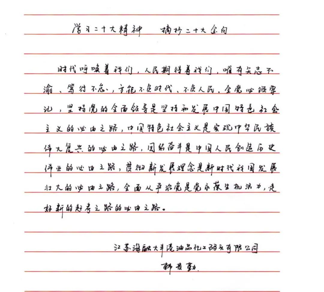 為深入學習宣傳貫徹黨的二十大精神,切實把思想和行動統(tǒng)一到黨的二十大精神上來,使黨員干部做到“學原文、悟原理、知原義”。近日,江蘇大豐港和順科技股份公司黨支部組織開展手抄黨的二十大報告“金句”活動,黨員干部積極參加、以筆抒懷,用特別的方式書寫對黨的赤誠忠心。