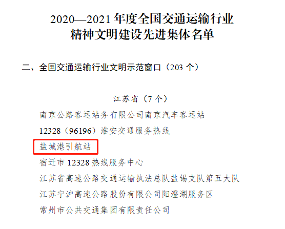 近日,交通運(yùn)輸部印發(fā)《關(guān)于命名2020—2021年度全國交通運(yùn)輸行業(yè)精神文明建設(shè)先進(jìn)集體的決定》,鹽城港引航站作為2018—2019年度“全國交通運(yùn)輸行業(yè)文明示范窗口”經(jīng)過復(fù)核確認(rèn),繼續(xù)保留稱號(hào),且是我市唯一獲得該項(xiàng)榮譽(yù)的單位。