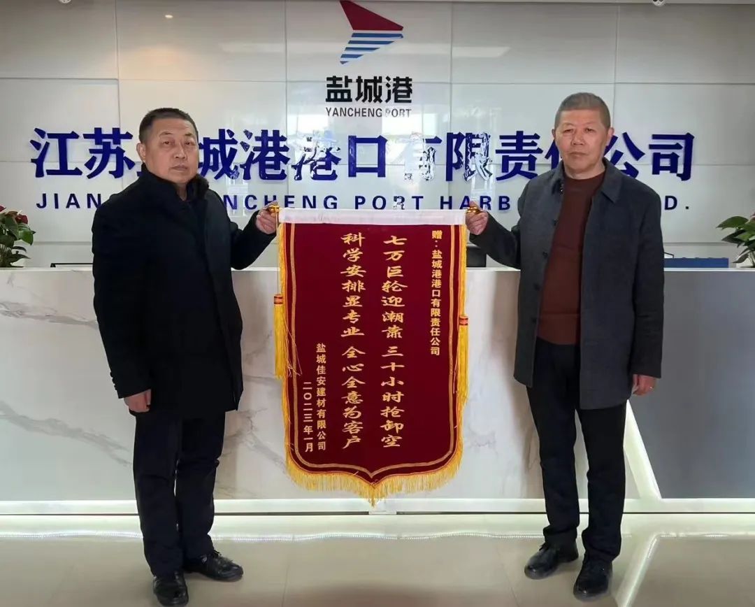 兔年伊始,鹽城港港口公司收到鹽城佳安建材有限公司贈送的錦旗,對港口公司所提供的優(yōu)質裝卸服務表示感謝。