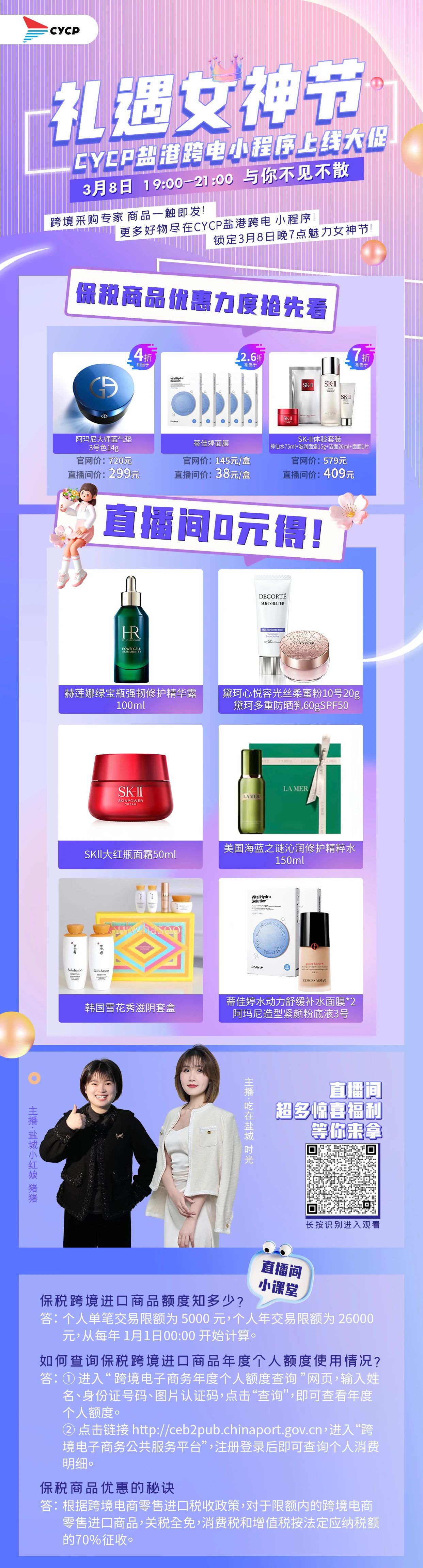 網(wǎng)紅主播線上推介,更有諸多好禮,參與直播間0元得,保稅優(yōu)品,全球好貨,盡在“CYCP鹽港跨電”直播間,快快掃碼預(yù)約直播,千萬別錯(cuò)過!