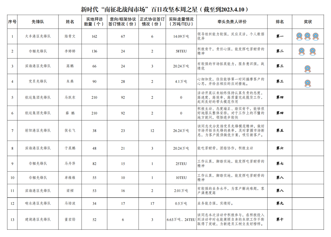第三名:濱海港區(qū)先鋒隊(duì) 高鵬(拜訪客戶66家,簽訂意向協(xié)議24份,簽訂正式協(xié)議3份,實(shí)際走量20.24萬(wàn)噸),黨員先鋒隊(duì) 朱燕(拜訪客戶90家,簽訂意向協(xié)議28份,簽訂正式協(xié)議2份,實(shí)際走量4.1萬(wàn)噸)