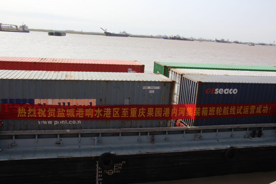 “嗚……”隨著汽笛的一聲長鳴,滿載集裝箱的“大港集003”號貨輪緩緩駛?cè)臌}城港響水港區(qū)5#泊位碼頭,貨船上的工作人員向岸邊拋出系泊纜繩固定貨船,碼頭上等待已久的吊機開始作業(yè),有條不紊地將集裝箱裝卸到拖車上。至此鹽城港響水港區(qū)至重慶果園港內(nèi)河集裝箱班輪航線試運營成功,這是響水港區(qū)從“無”到“有”首次迎來的集裝箱貨輪。同時標志著通榆河段阜寧至響水正式開通內(nèi)河集裝箱運輸,掀開了鹽城港響水港區(qū)與阜寧港區(qū)“港港聯(lián)動”的全新篇章。