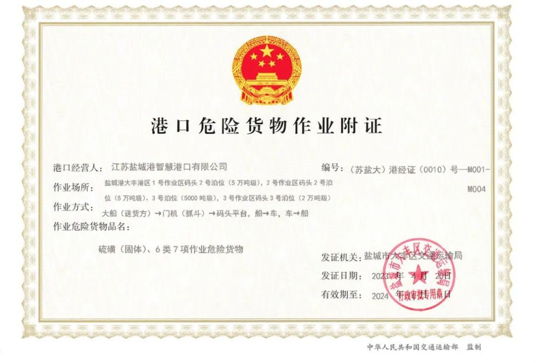 4月27日下午,經(jīng)交通部門正式批準(zhǔn),鹽城港大豐港區(qū)集裝箱碼頭順利取得港口危險(xiǎn)貨物作業(yè)附證,標(biāo)志著鹽城港集裝箱產(chǎn)業(yè)正式具備危險(xiǎn)貨物作業(yè)能力。
