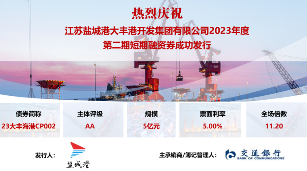 6月29日,大豐港開發(fā)集團(tuán)成功發(fā)行2023年度第二期短期融資券,本期短期融資券金額5億元,發(fā)行利率5%,認(rèn)購(gòu)倍數(shù)11.2倍,創(chuàng)下2023年度鹽城地區(qū)同一品種申購(gòu)倍數(shù)最高紀(jì)錄,充分反映了投資機(jī)構(gòu)對(duì)鹽城港發(fā)展的高度認(rèn)可和信任,也為后續(xù)資本市場(chǎng)融資奠定了堅(jiān)實(shí)基礎(chǔ)。