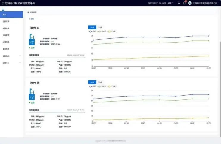 基于激光散射的監(jiān)測設(shè)備和江蘇省港口粉塵在線監(jiān)管系統(tǒng)上線后,通過碼頭東側(cè)和西側(cè)的2個揚(yáng)塵在線監(jiān)測儀,能掃描整個散貨作業(yè)碼頭,實(shí)時獲得碼頭作業(yè)區(qū)的PM2.5、PM10、TSP總懸浮顆粒物濃度數(shù)據(jù),實(shí)現(xiàn)碼頭全域100%監(jiān)測全覆蓋。
