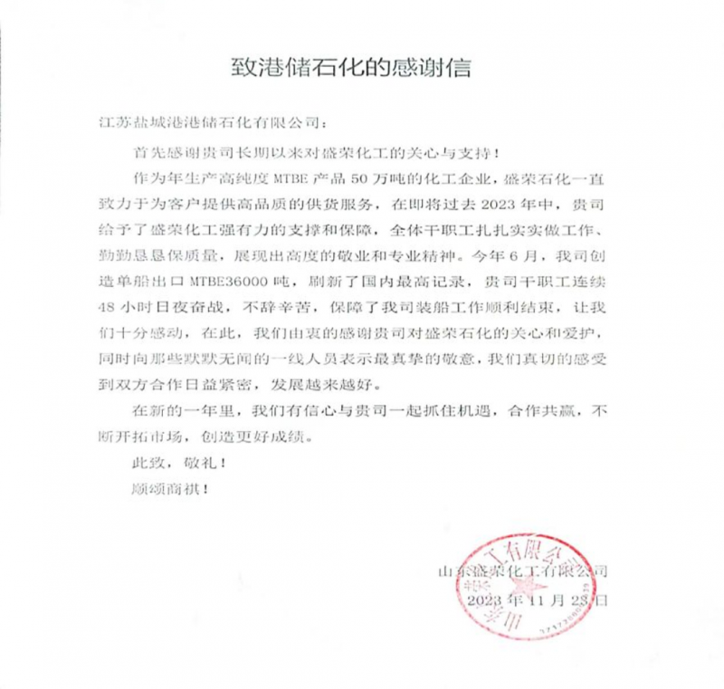 今年以來(lái)港儲(chǔ)石化公司全體干部職工堅(jiān)持以“時(shí)間就是金錢(qián),程序體現(xiàn)規(guī)矩,質(zhì)量鑄就精品,效率就是生命”為宗旨,不斷提升服務(wù)品質(zhì)及工作效率,獲得了客戶(hù)的贊賞與肯定。近期,合作客戶(hù)山東玉皇盛榮化工寄來(lái)一封感謝信,信中內(nèi)容充分肯定了港儲(chǔ)石化的服務(wù)品質(zhì),并由衷地表達(dá)了感謝。