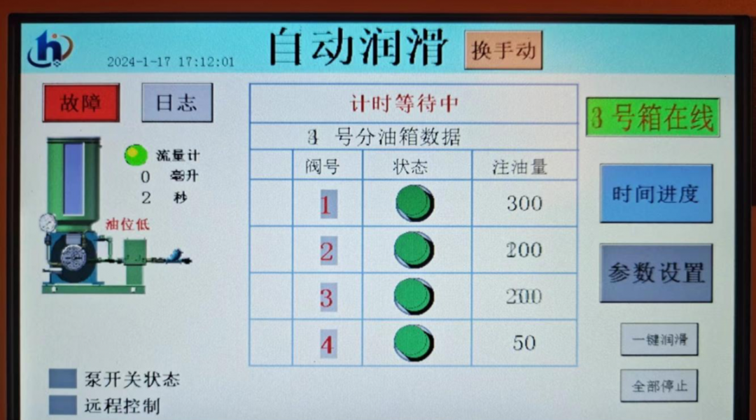 而本次改造后的集中潤(rùn)滑系統(tǒng)是信息技術(shù)、自動(dòng)化控制技術(shù)、現(xiàn)代潤(rùn)滑技術(shù)充分優(yōu)化集成的高新技術(shù)產(chǎn)品,預(yù)計(jì)每年可以降低港區(qū)人力成本及設(shè)備維修成本不少于15萬元。具體可體現(xiàn)出九大優(yōu)點(diǎn):能夠精準(zhǔn)設(shè)置、控制每個(gè)智能分油箱出口的出油量;能夠精確設(shè)置、控制不同機(jī)構(gòu)的注油周期;能夠設(shè)置、控制每個(gè)潤(rùn)滑點(diǎn)的需油量;能夠監(jiān)控智能分油箱每個(gè)出油口的堵塞故障和報(bào)警;能夠監(jiān)控系統(tǒng)主管路的泄漏故障及報(bào)警;能夠監(jiān)控油桶儲(chǔ)油量的缺失及報(bào)警;能夠通過控制箱進(jìn)行查看實(shí)際潤(rùn)滑情況及故障;能夠根據(jù)機(jī)構(gòu)運(yùn)行時(shí)間設(shè)置大周期,且故障信號(hào)、注油信息與主機(jī)PLC互聯(lián)互通并可在手機(jī)端進(jìn)行實(shí)施監(jiān)控設(shè)備潤(rùn)滑狀況的操作。